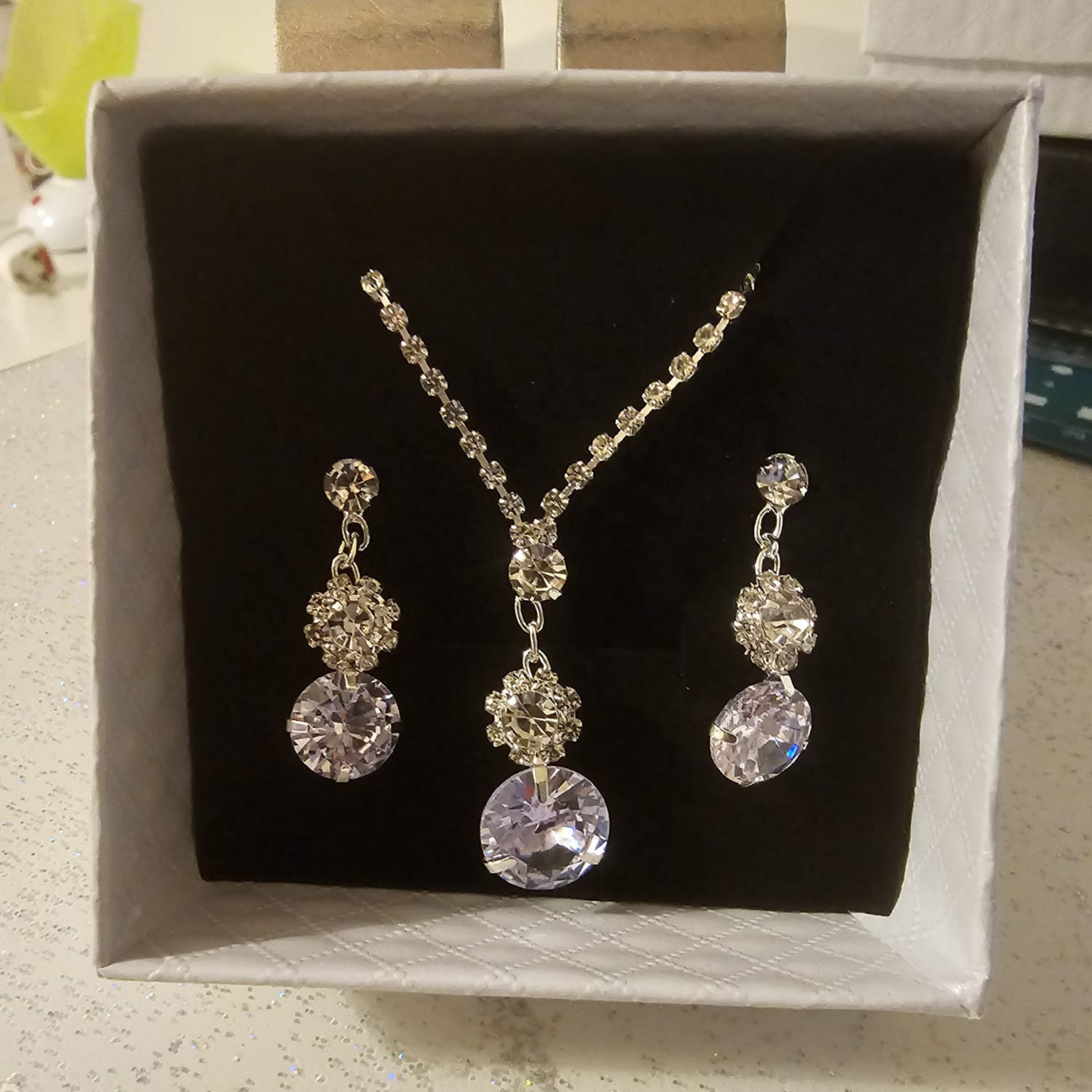 Stunning bridal rhinestone jewelry set with double drop design. Includes matching earrings and necklace. Perfect for weddings and banquets. Comes in gift box.