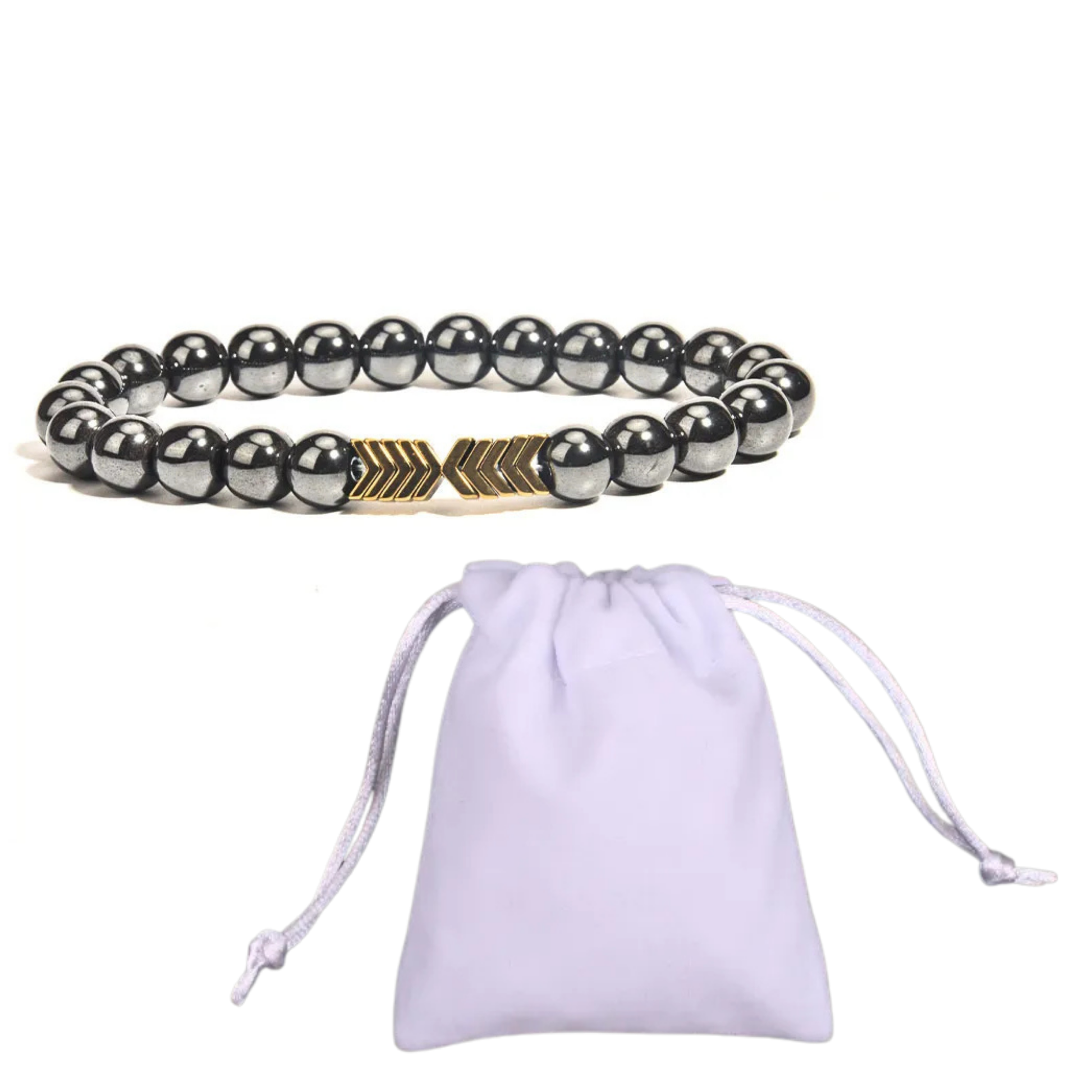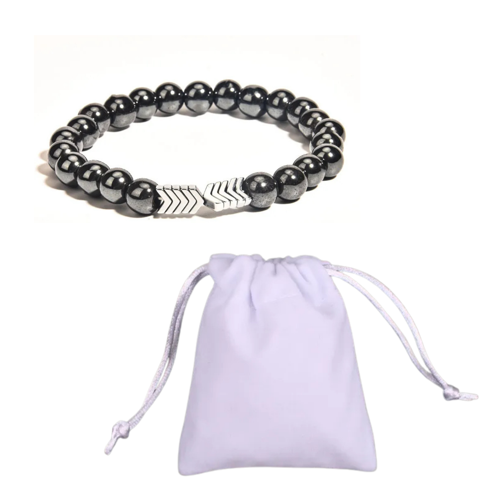 Magnetic copper bracelet with 8mm stone beads and geometric arrow pendant. Available in gold and silver copper. Includes gift pouch. Lightweight 19g design.